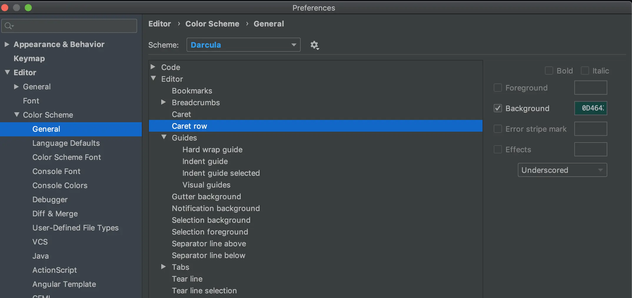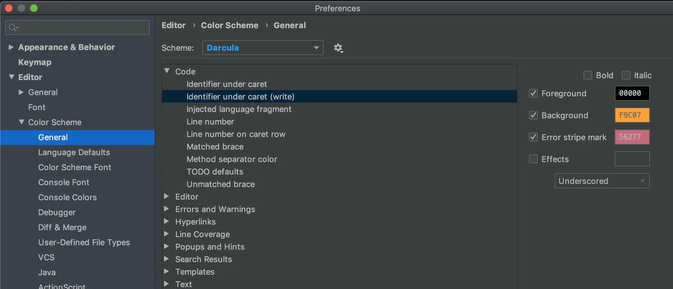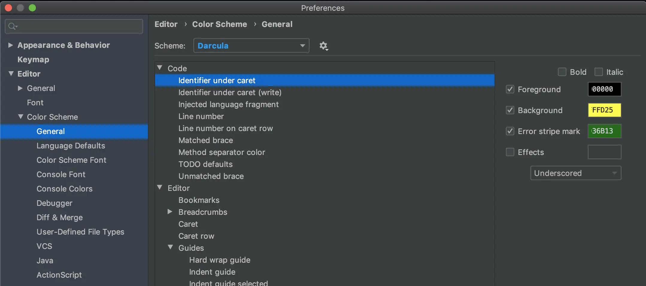 IDEA颜色配置(持续更新) GanZhiXiong 2020-06-11 639 阅读1分钟 光标所在行背景色 Background: 0D4642 高亮显示选中的相同变量、类、方法等 indentifier under caret Background: FFFD25 indentifier under caret (write) Foreground: 000000 Background: FF9C07