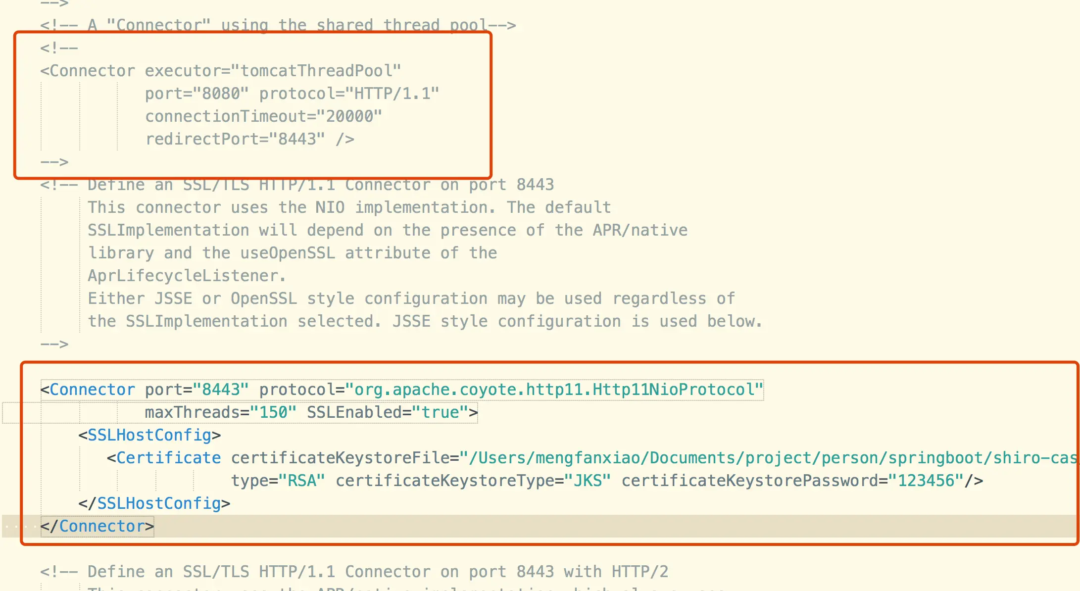 <Connector port="8443" protocol="org.apache.coyote.http11.Http11NioProtocol" maxThreads="150" SSLEnabled="true"> <SSLHostConfig> <Certificate certificateKeystoreFile="/Users/mengfanxiao/Documents/project/person/springboot/shiro-cas/cas/keystore/liuyx.keystore" type="RSA" certificateKeystoreType="JKS" certificateKeystorePassword="123456"/> </SSLHostConfig> </Connector>
