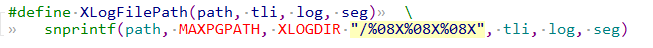 对应于xlog,其初始化的入口函数是BootStrapXLOG,该函数只会在初始化的时候调用一次,主要用于创建pg_control文件(这一部分放在checkpoint的时候再去详细说明)和初始化第一个xlog segment。其中,xlog文件的命令规则如下,即由3个参数组成共24位的十六进制字符串,每个参数占8位