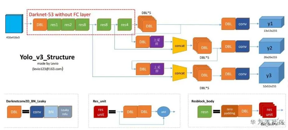 好了,下面该今天的主角登场了——YOLOv3,先看看结构图,来个直观的了解: