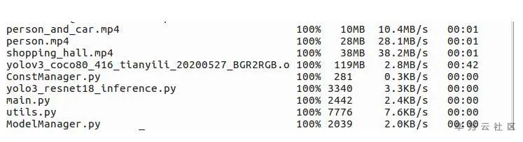 scp -r YOLOv3_COCO HwHiAiUser@192.168.1.2:/home/HwHiAiUser注意,我是在YOLOv3_COCO文件下目录下使用的命令,所以直接用文件夹名字就行,否则需要指定路径,使用的是USB连接开发板,如果用网线连接,IP可能不同,更多拷贝文件的方法,请参考博文每天进步一点点——使用scp命令在Atlas 200 DK和虚拟机之间传输文件(文件夹)