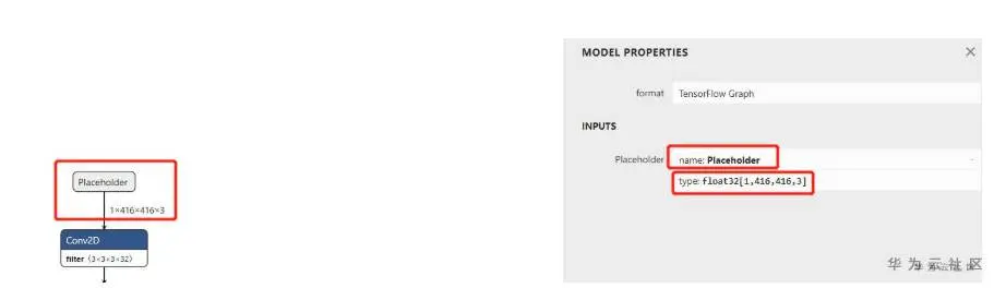 下面是模型转化,通过Netron可以看到模型输入节点为Placeholder 输入为1, 416,416,3。这表示模型输入为一张图片,图片为416*416大小,3通道,也就是我们常用的RGB格式。