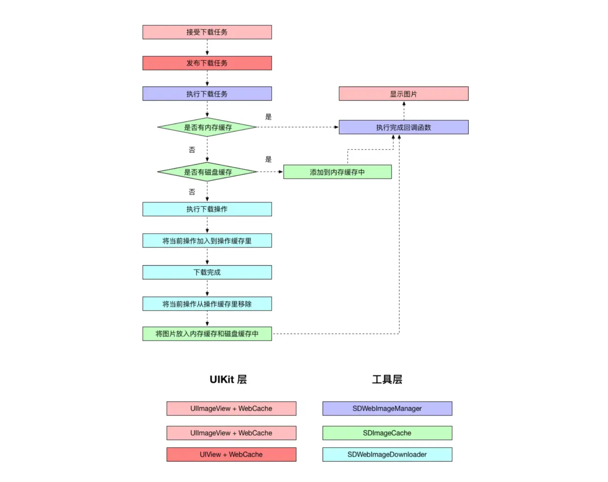 imageView sd_setImageWithURL 就能直接给imageVIew赋值图片 这个框架的核心类是SDWebImageManager 在外头面 UIImageView+webCache和 UIButton+webCache为下载提供接口。内部有SDWebimageManager 处理协调SDWebImageDownloader和SDWebImageCache SDWebImageDownloader负责处理下载任务 SDWebImageCache负责缓存的工作,添加,删除 查询缓存