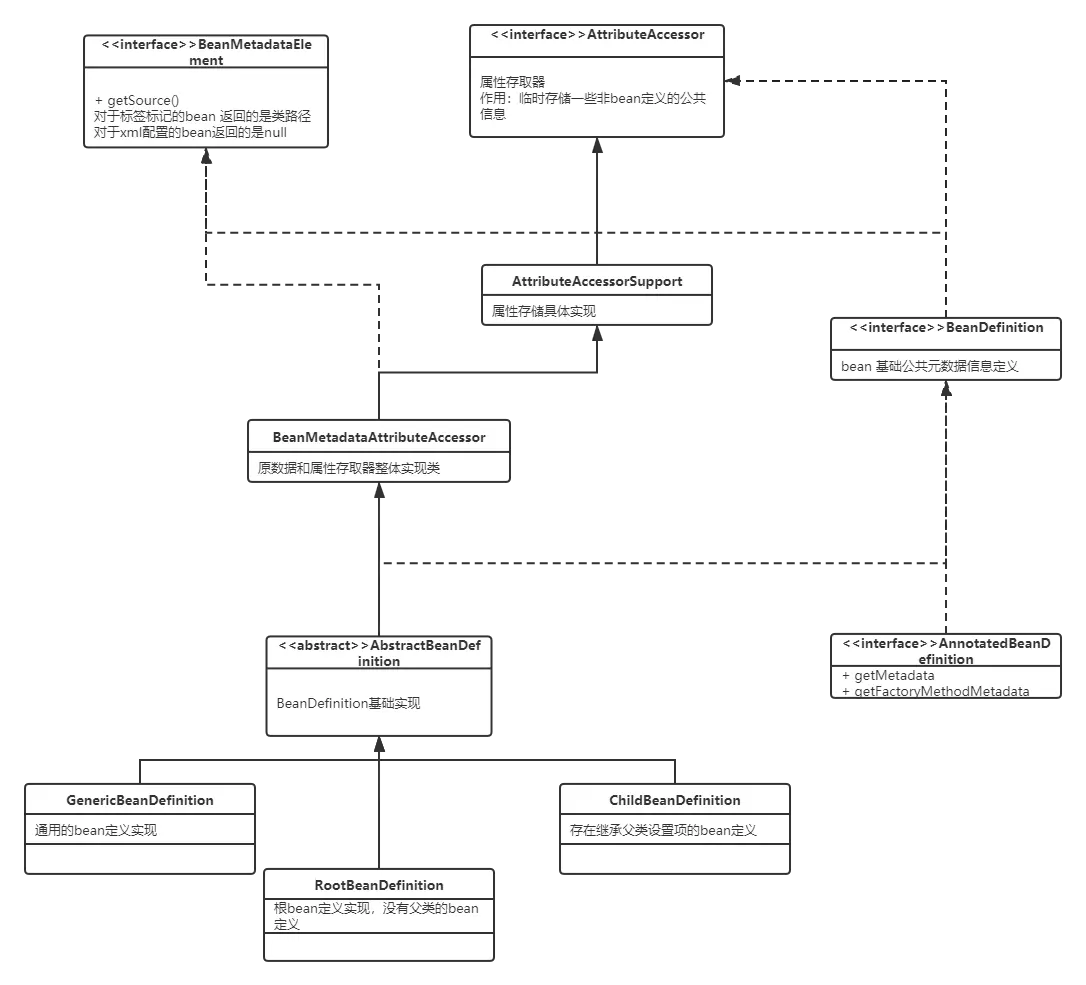 BeanDefinition接口继承了两个接口AttributeAccessor、BeanMetadataElement, 从名字可以看出