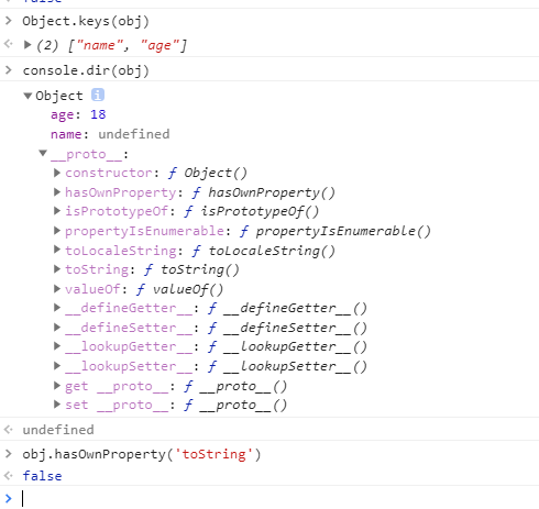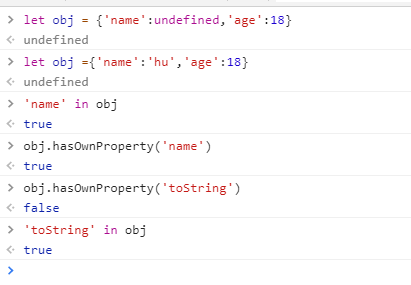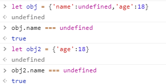 obj.xxx === undefined不能断定xxx是否为obj的属性 obj含有name属性,但是值为undefined;obj2就直接没有name这个属性名
