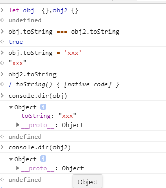 let obj ={},obj2={} //obj和obj2共有toString obj.toString = 'xxx' //只会改obj自身属性 obj2.toString还在原型上