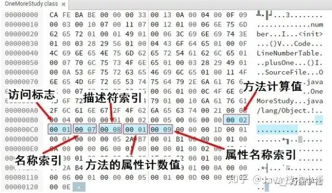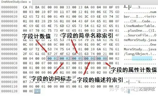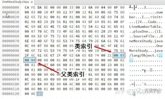 #18 = Utf8 java/lang/Object类索引为0x0003,去常量池里找索引为3的类描述符,类描述符中的索引为17,再去找索引为17的字符串,就是“OneMoreStudy”。