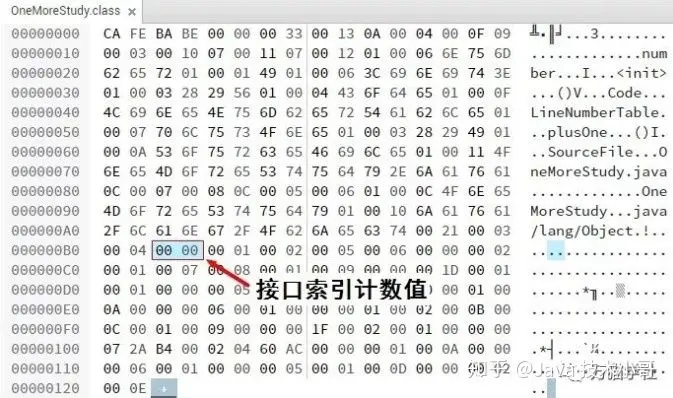 接口索引集合(interface)是一组u2类型的数据的集合,由于java语言允许实现多个接口,所以接口索引也有多个,它们按照implements语句后的接口顺序从左到右依次排列在接口索引集合中。接口索引集合的第一项数据是接口集合计数值(interfaces_count),表示有多少接口索引。如果该类没有实现任何接口,那么该计数值为0,后面的接口索引表不占任何字节。之前的例子OneMoreStudy类没有实现任何接口,所以接口集合计数值就是0,如下图: