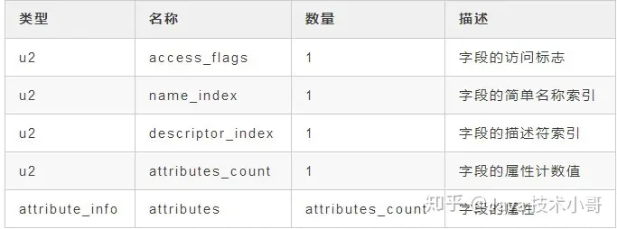 字段表(field_info)是用来描述接口或类中声明的变量。包括类级变量(静态变量)和实例级变量(成员变量),但是不包括在方法内部声明的局部变量。具体结构如下表: