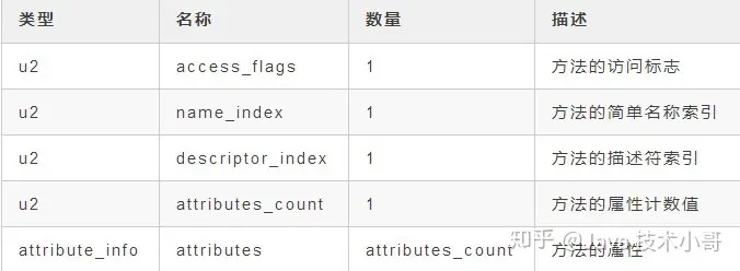 方法表的结构和字段表的是一样的,也是依次包括了访问标志(access_flags)、名称索引(name_index)、描述符索引(descriptor_index)和属性表集合(attributes)。具体如下表: