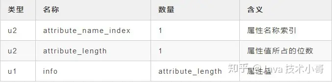 对于每个属性,它的名称都从常量池中引用一个CONSTANT_Utf8_info类型的常量,而属性值的结构则是完全自定义的,只需要用一个u4类型来说明属性值所占的位数就可以了。具体结构如下: