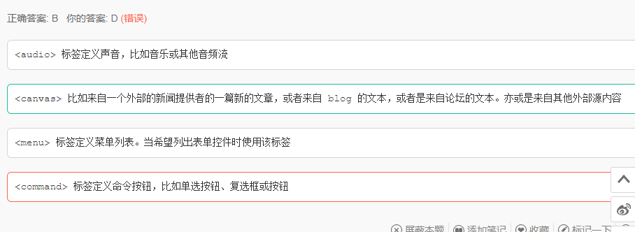 < canvas> 标签定义图形,比如图表和其他图像。< canvas> 标签只是图形容器,您必须使用脚本来绘制图形。 B错误,(写成了其他标签的功能了)。