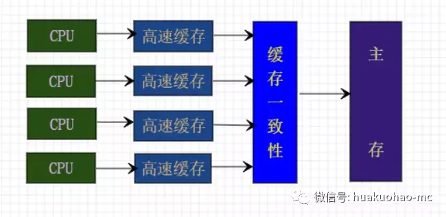 现在的计算机几乎都是多核CPU了。而每一核都有自己的高速缓存,用于存储一些指令和变量。缓存中的内容,其它核是看不到的,只有同步到主内存之后才能被其他CPU看到。如何以及何时将缓存里面的值写入主存凭借的是缓存一致性。大概应该是这个样子。