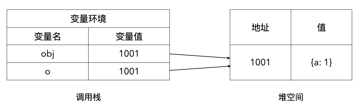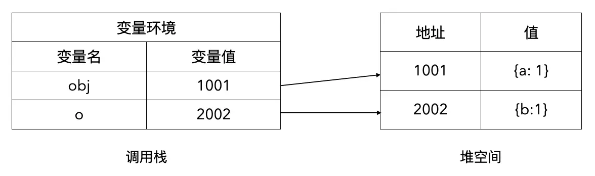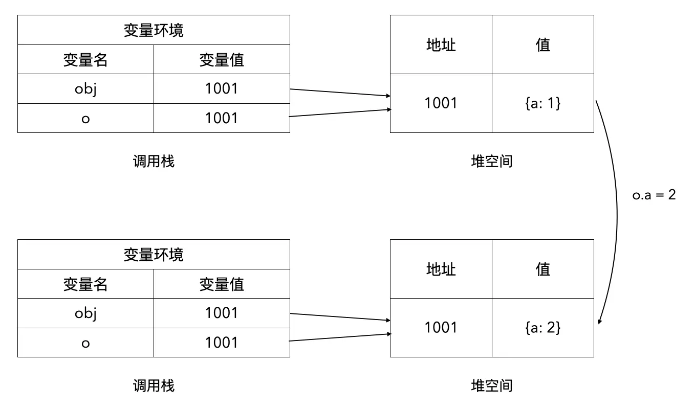 由于在函数 foo 内部执行 o.a = 2,修改的是堆空间中的对象,而这个对象和 obj 共享,因此也影响到了 obj 的变化: