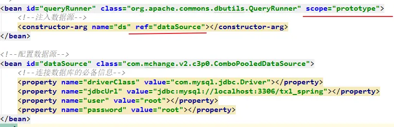 注意:dataSource在bean.xml是单例创建的,所以使用时,也用的是同一个dataSource。