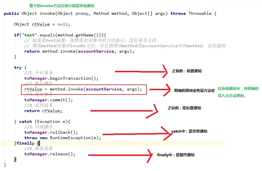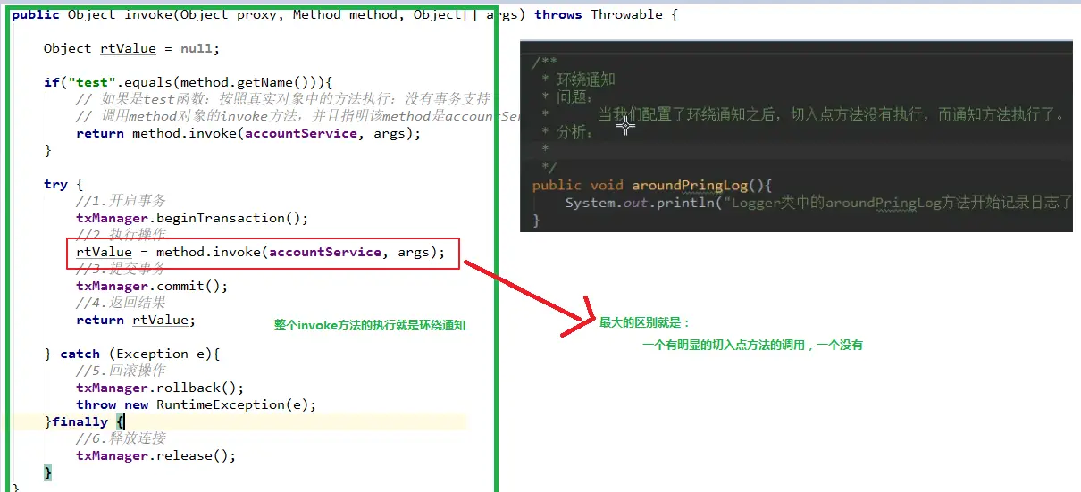 通过对比动态代理中的环绕通知代码,发现动态代理的环绕通知有明确的切入点方法调用,