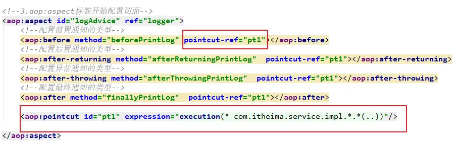 配置好之后,上面4行的就不用在写pointcut属性了,引用此处的aop:pointcut标签即可