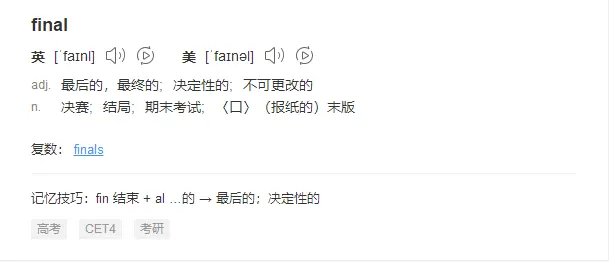 对于Java中的 final 关键字,我们首先可以从字面意思上去理解,百度翻译显示如下: