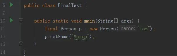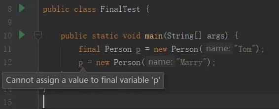 可以看到,首先通过 final 关键字修饰一个对象 p,然后接着将 p 对象指向另一个新的对象,发现报错,也就是说final修饰的引用类型是不能改变其引用地址的。