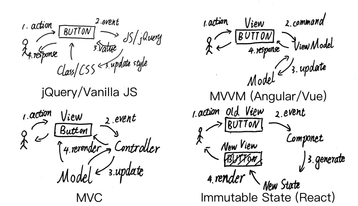 jQuery 时代,前端开发者使用 JavaScript 的模式是从页面中获取 DOM 元素,添加事件,然后通过 class 和 style 对页面进行动态地变更,以完成对用户行为的响应;