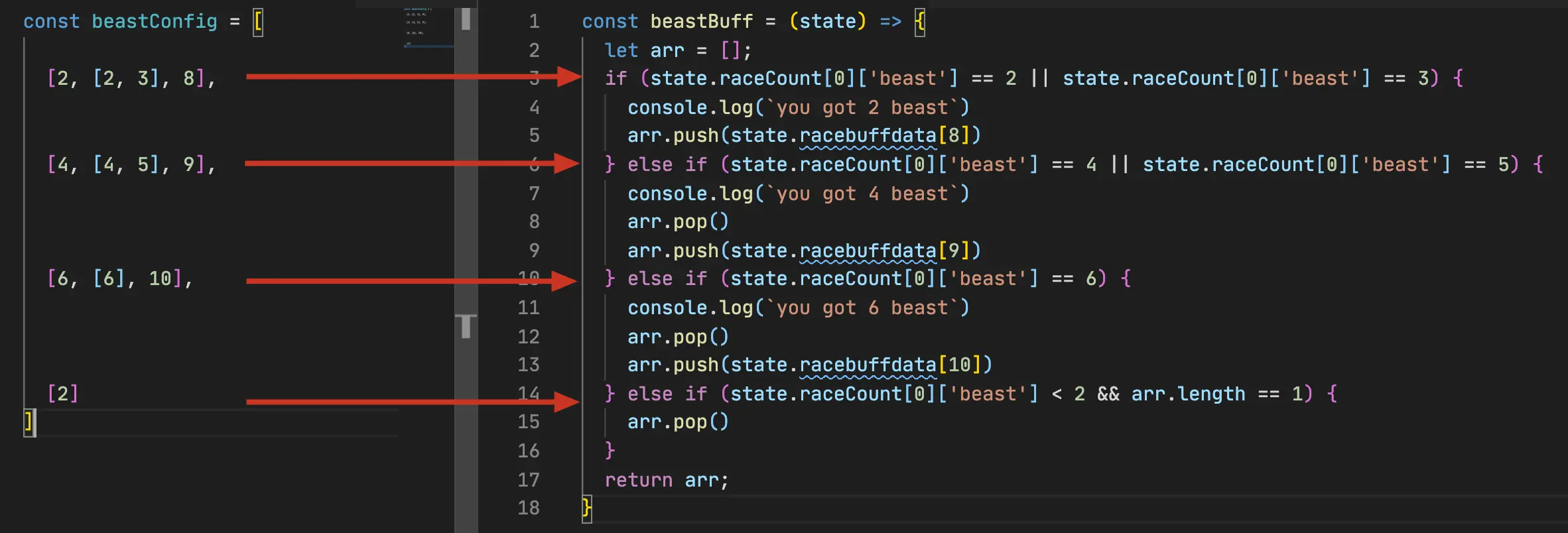 这份代码中的每一个数字在上面的 beastBuff 函数中都可以一一找到,那么要怎么将它们复用到逻辑代码中,实现与原本的代码一样的功能呢?