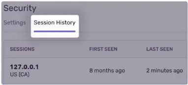 在“会话历史记录”选项卡下查找会话的历史列表,包括第一次看到和最后一次看到的时间戳。