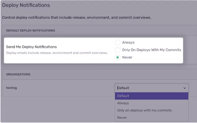 选择部署通知选项以跟踪部署详细信息,如发布版本、环境和提交审阅。从每个组织旁边的下拉列表中微调选项。