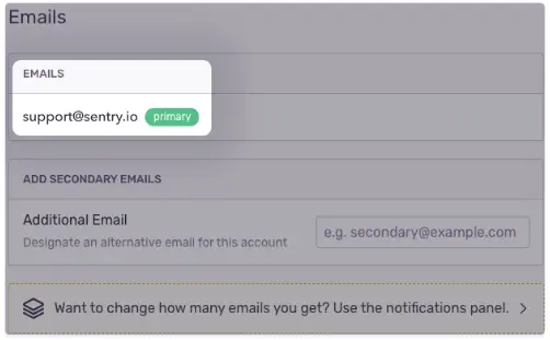 默认情况下,用于登录Sentry帐户的电子邮件地址是您的主电子邮件地址。在“添加辅助电子邮件”部分下添加其他电子邮件地址。