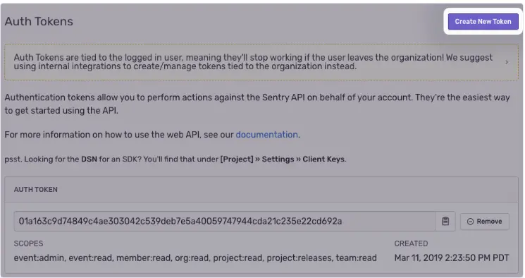 身份验证令牌允许您代表您的帐户对Sentry API执行操作。要创建一个,请单击“创建新令牌”按钮。