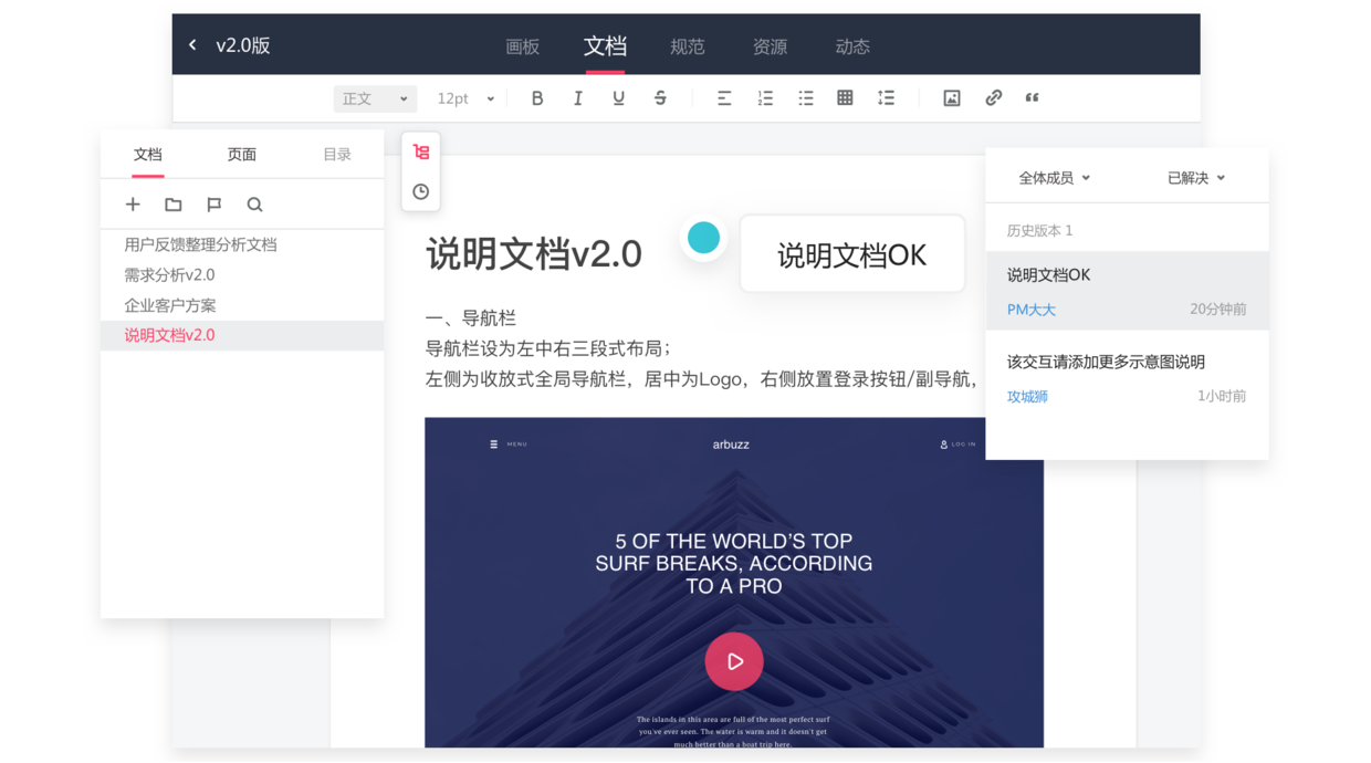 ↑ 在线撰写和管理产品文档,与设计稿深度引用,文档原型一站解决。
