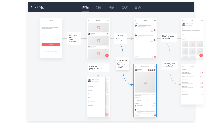 摹客可以说是为设计师小伙伴们量身打造的协作平台。在摹客,设计师快速上传Sketch、PS、XD的设计稿后,团队成员可以在线审阅,及时反馈意见。设计师可以根据反馈对设计稿进行调整,调整后的设计稿再次上传会自动生成历史版本,不同版本之间可以一键对比异同,轻松管理不同版本设计稿。此外,摹客还提供了8种交互方式和15种动画效果,可以呈现丰富的演示效果。