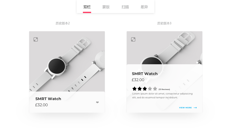 ↑ 设计稿修改后自动生成历史版本,可使用四种方式对比版本异同,轻松管理历史版本。