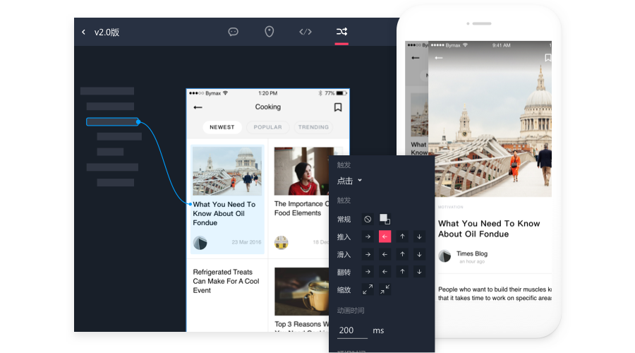 ↑ 设计稿上传至摹客后,可设置多种交互方式,高保真快速转化为可交互原型。
