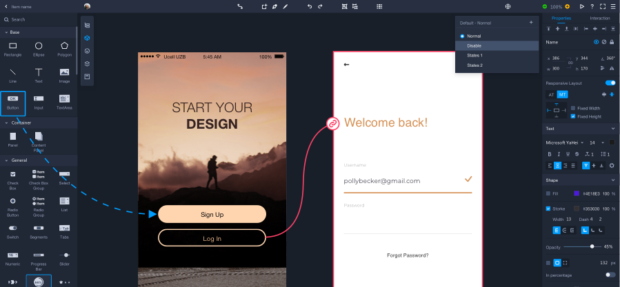 ● 支持页面交互、状态交互、命令交互,以及设置多种触发方式和曲线,快速制作交互原型。
