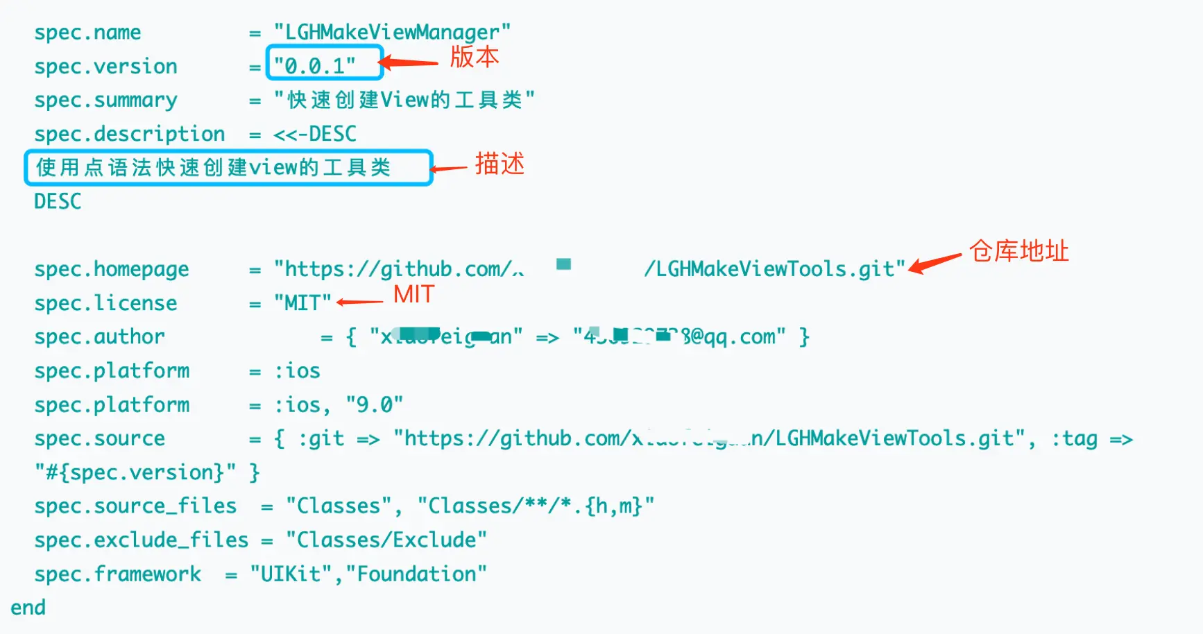 第五步:在项目中打开 LGHMakeViewManager.podspec文件,配置该文件