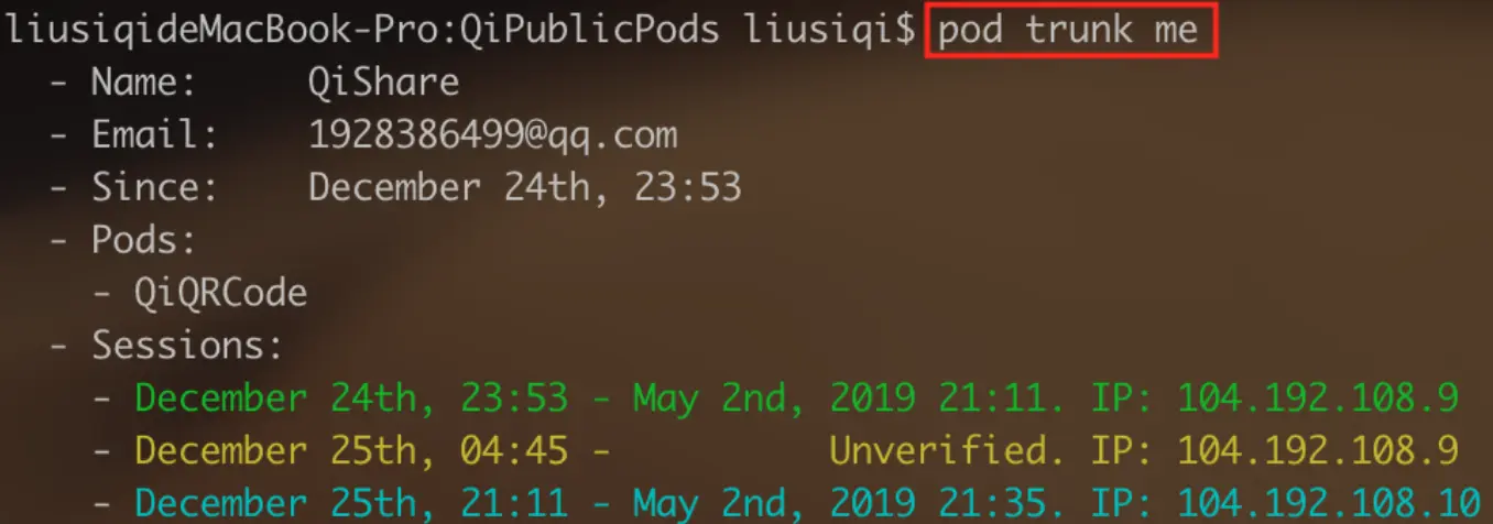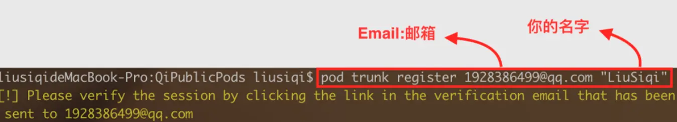 第七步:注册Trunk 先看看有没有注册,使用命令:pod trunk me。若已注册,则本步直接跳过 若未注册,则: 打开终端,使用命令:pod trunk register EMAIL [YOUR_NAME]。 如图: