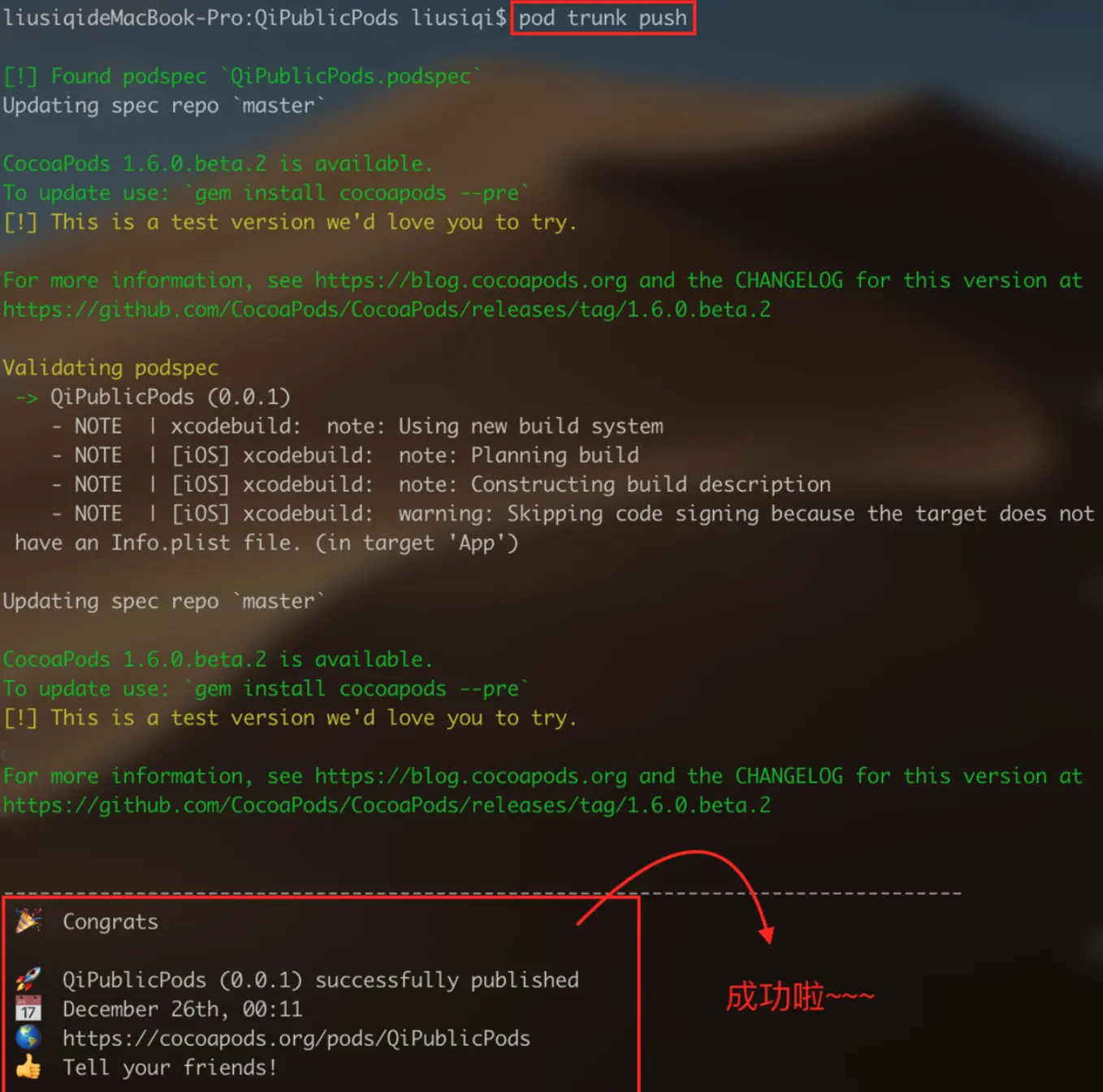 第九步:校验没有问题后,使用命令:pod trunk push