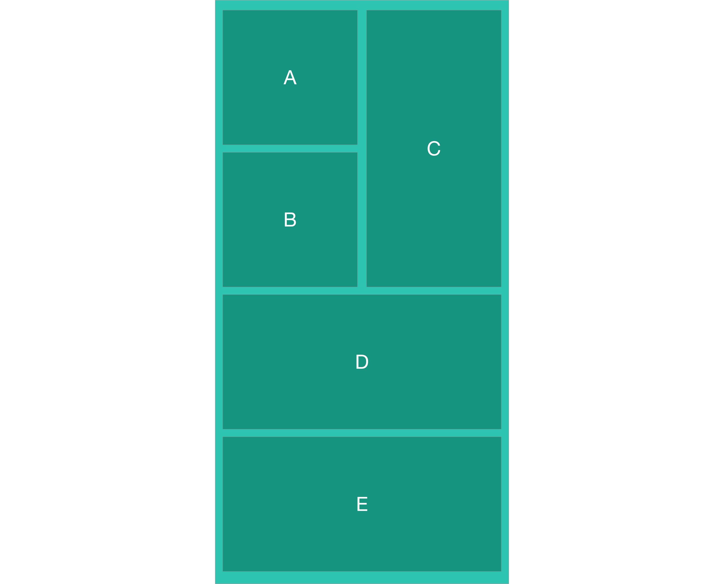 我们来分析下上面的布局效果:排版共有 5个模块组成。 我们分别用 A、B、C、D、E 来标记。如下图: