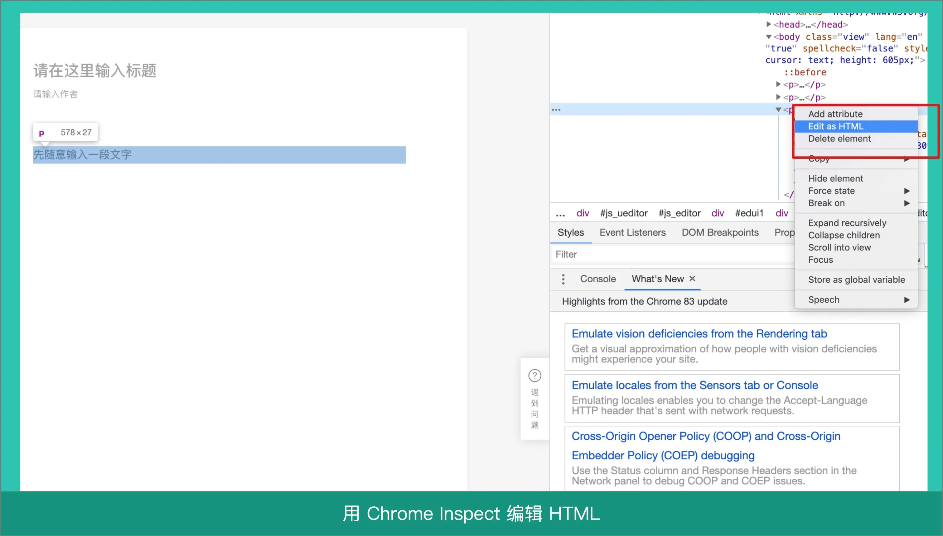 这时候我们就要用到 Chrome Inspect,对于做前端的同学来说,Chrome Inspect 是调试过程中离不开的工具,它可以直接帮助我们修改前端 HTML 代码。因此提交代码的步骤是: