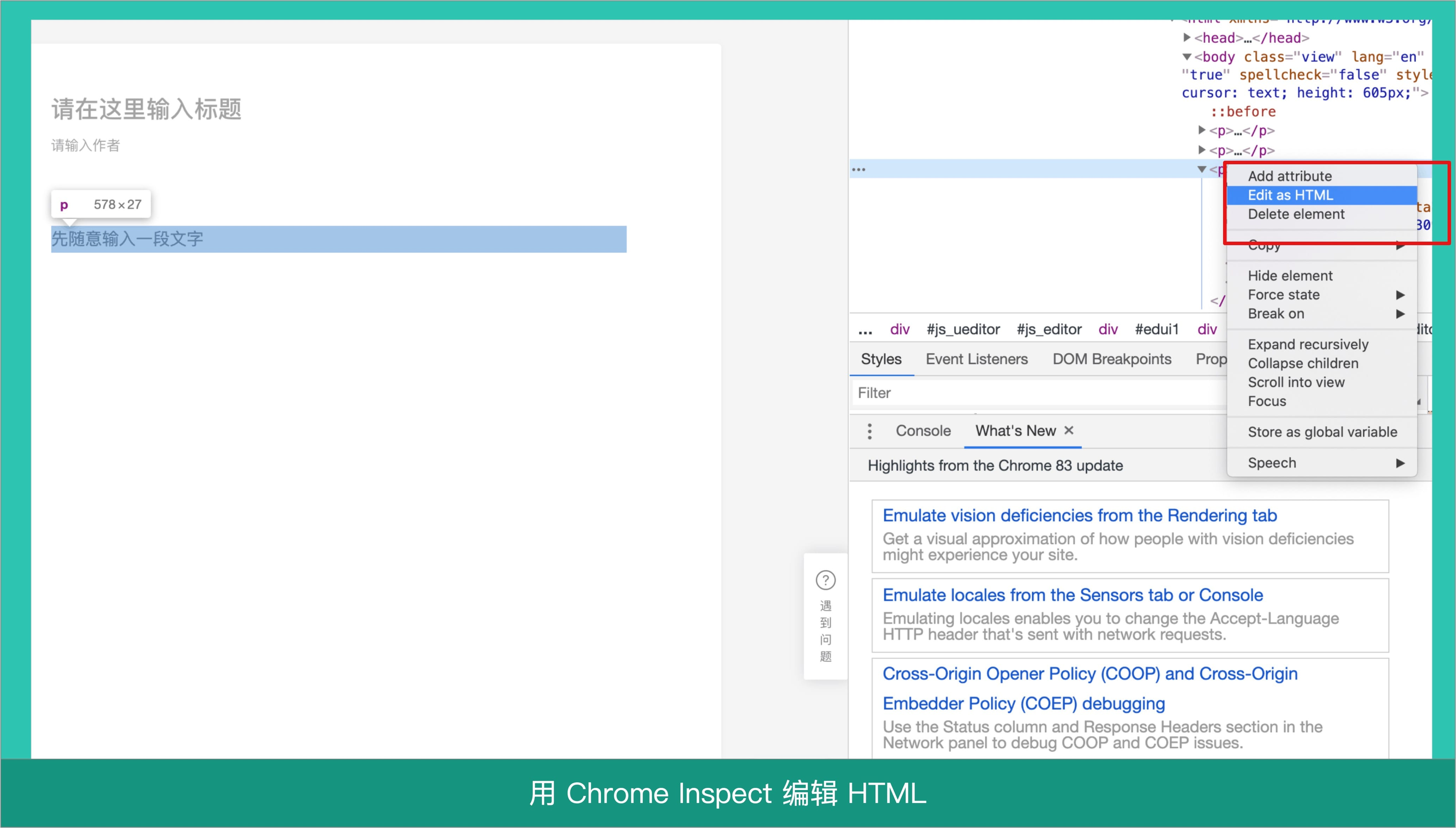- 用 Chrome 浏览器打开微信公众号的图文编辑器,在文章中随意输入一句话