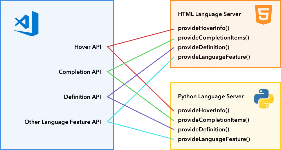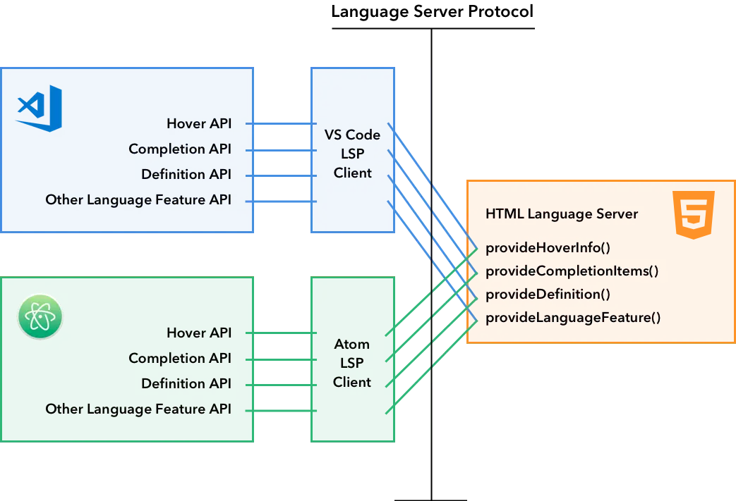 在上图中,Language Server 直接调用VSCode的API来操作编辑器,两者之间是强耦合的。这样就产生了一个新的问题,假如我们想要在Sublime也实现相同功能,就要再写一个以来Sublime API的Server。所以,VSCode进一步改进了这个方案,提供了基于LSP(Language Server Protocol)的Client-Server模式。在这个模式中,Language Server 和 编辑器只需要各自实现 LSP 协议就可以了。