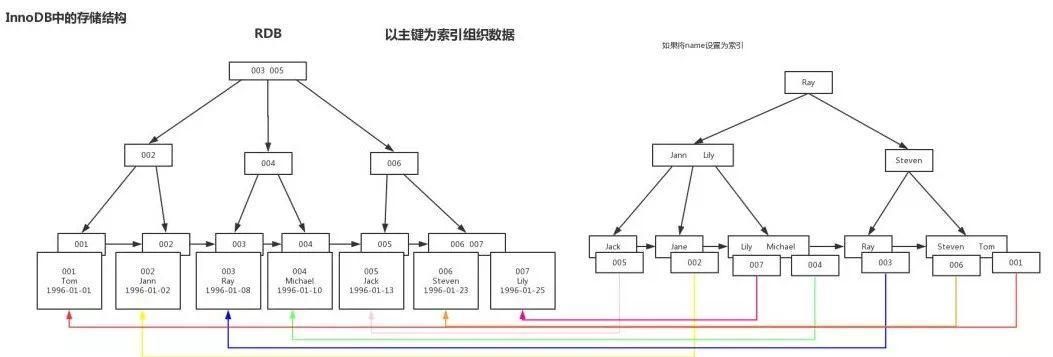 2、B+Tree在新增数据时,会根据索引指定列的值对旧的B+Tree做调整。3、从物理存储结构上说,B-Tree和B+Tree都以页(4K)来划分节点的大小,但是由于B+Tree中中间节点不存储数据,因此B+Tree能够在同样大小的节点中,存储更多的key,提高查找效率。4、影响MySQL查找性能的主要还是磁盘IO次数,大部分是磁头移动到指定磁道的时间花费。5、MyISAM存储引擎下索引和数据存储是分离的,InnoDB索引和数据存储在一起。6、InnoDB存储引擎下索引的实现,(辅助索引)全部是依赖于主索引建立的(辅助索引中叶子结点存储的并不是数据的地址,还是主索引的值,因此,所有依赖于辅助索引的都是先根据辅助索引查到主索引,再根据主索引查数据的地址)。