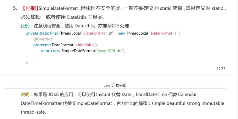 SimpleDateFormat 禁止定义成 static 变量或者全局共享变量,因为它是线程不安全的,都被写进阿里巴巴的《Java开发手册》里了: