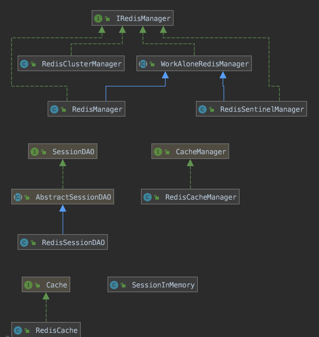继承AbstractSessionDAO 抽象类 这里面也是通过 IRedisManager接口对缓存进行增删改查操作 内存存储对象为ThreadLocal本质上还是一个Map集合