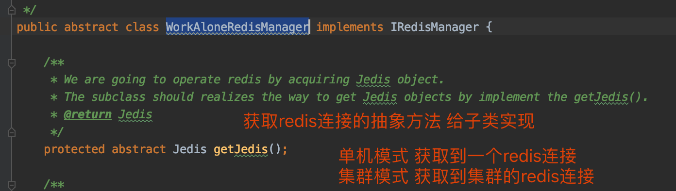 WorkAloneRedisManager 的2个实现类 单机和集群分别实现获取redis连接的抽象方法