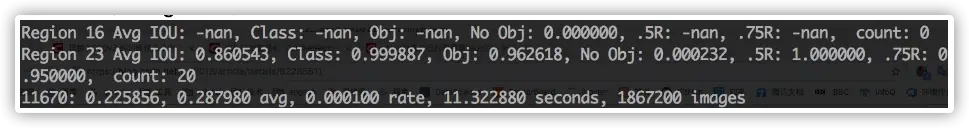 11670(当前迭代batch次数): 0.225856(总体loss), 0.287980 avg(平均loss), 0.000100 rate(当前的学习率,在cfg中定义), 11.322880 seconds(当前batch耗费时间), 1867200 images(参与训练的图片总数) |