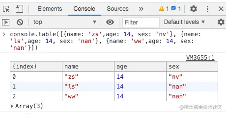 当你有一个数组(或者是类数组的对象,或者就是一个对象),你可以使用 console.table 方法以一个漂亮的表格的形式将它打印出来。它不仅会根据数组中的对象的所有属性去计算出表中的列名,而且这些列都是可以缩放甚至排序 😺 是不是很奇妙呀~