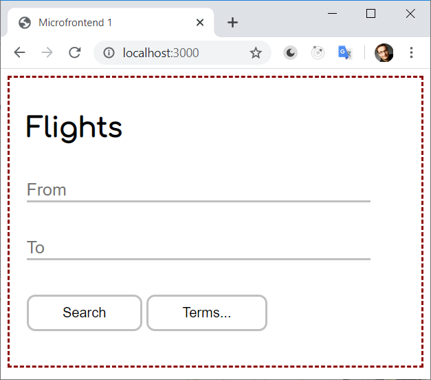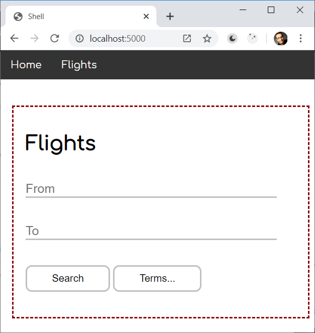 这个例子首先包含一个空壳涵盖两个模块(Home、Flights),这个空壳应用可以按需的加载各个微前端模块。