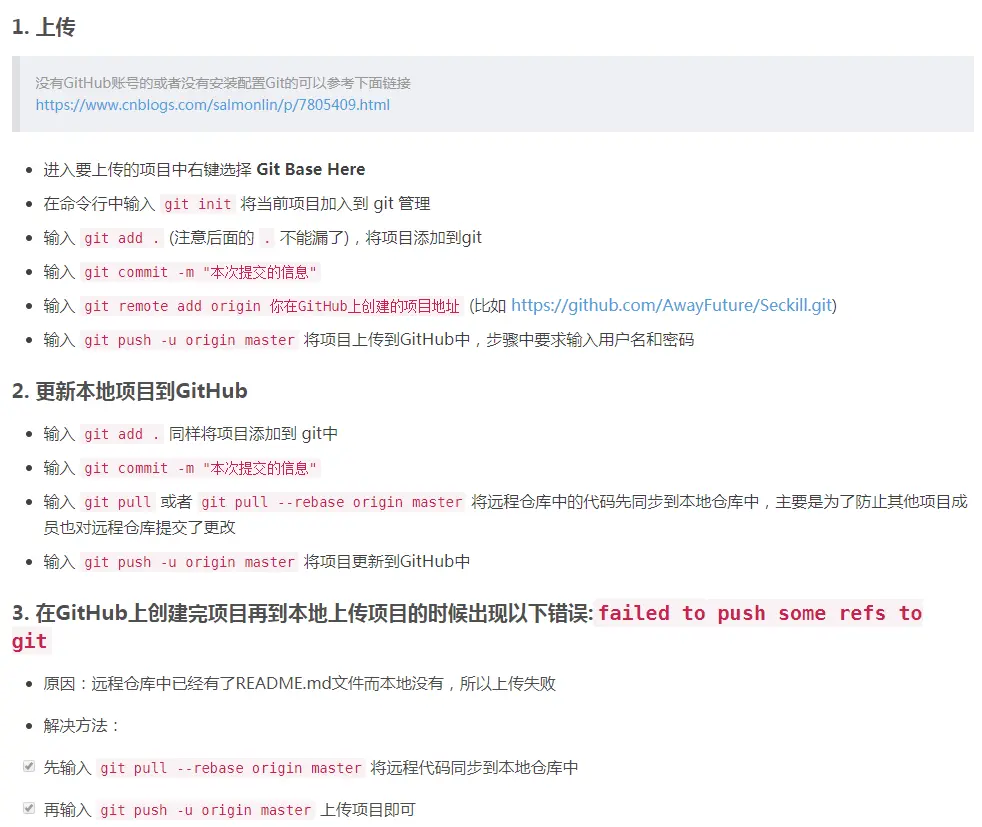 webstorm本地项目提交到git Z_KnowMore 2020-06-12 198 阅读1分钟 在Terminal中 1. git init 2. git add README.md 3. git commit -m "介绍" 4. git remote add origin https://github.com/explodeStar/react-study.git 提交到git地址 5. git push -u origin master