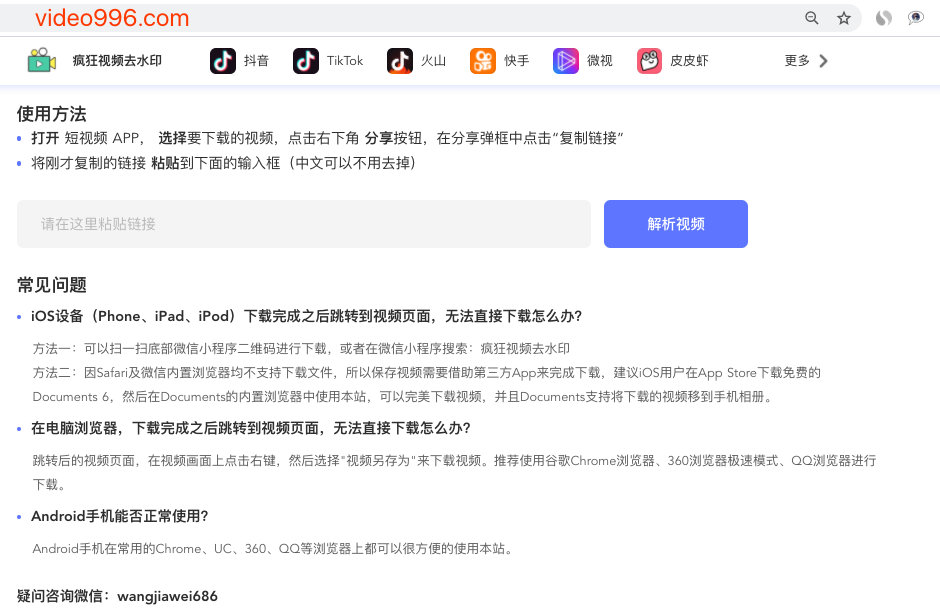 支持解析快手、抖音、Youtube、Tiktok、火山、今日头条、西瓜视频、皮皮虾、小咖秀、趣多拍、微视、美拍、秒拍、网易云、TikTok、哔哩哔哩、陌陌、映客、迅雷、阳光宽频、全民 K 歌、刷宝、WIDE 短视频、小红书、等平台的视频,而且解析出来的网站视频没有水印。